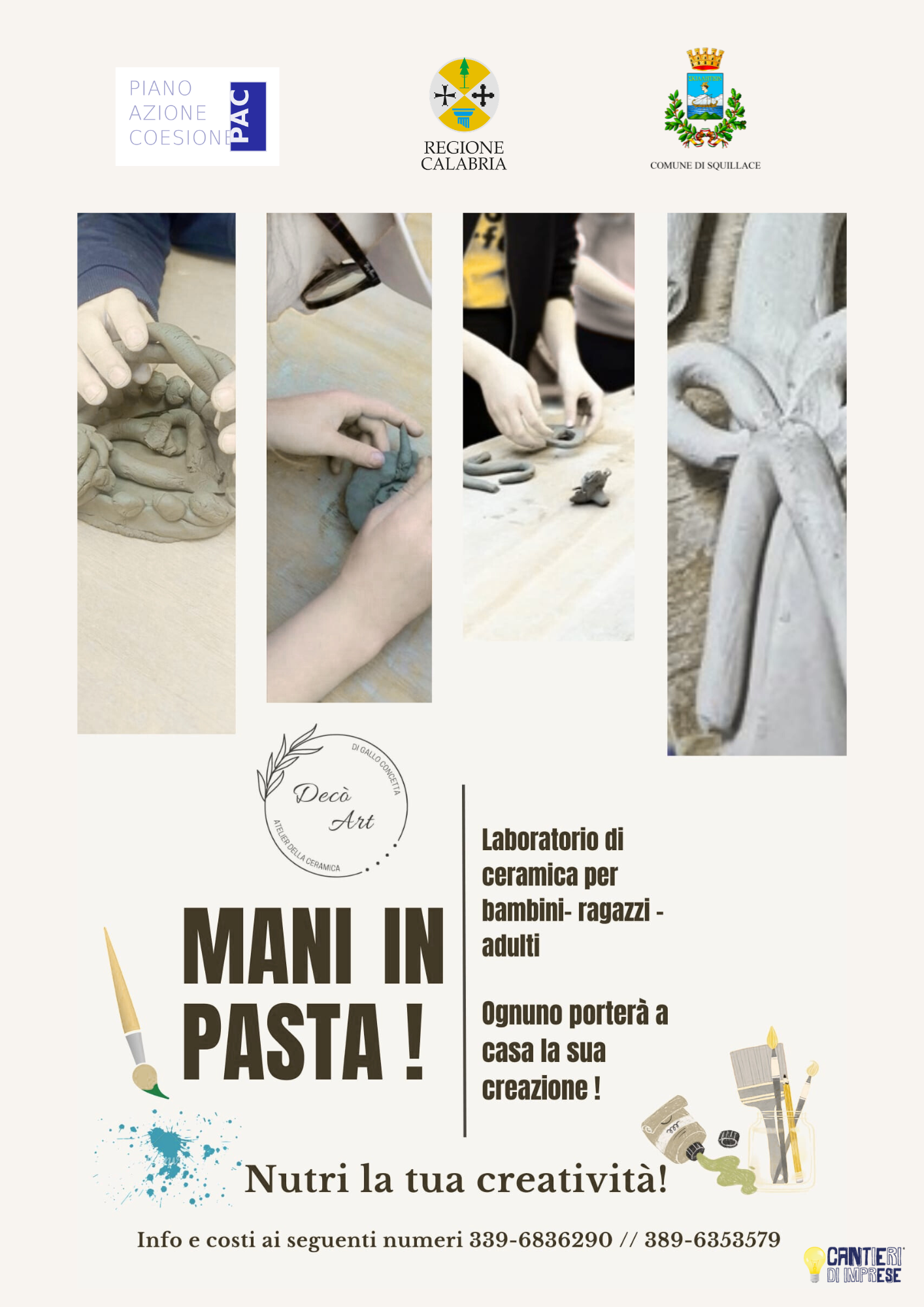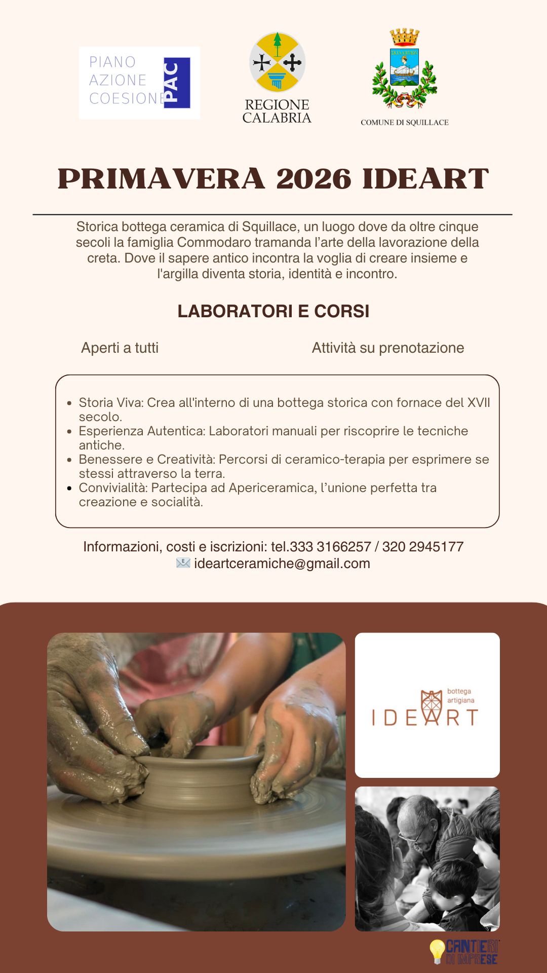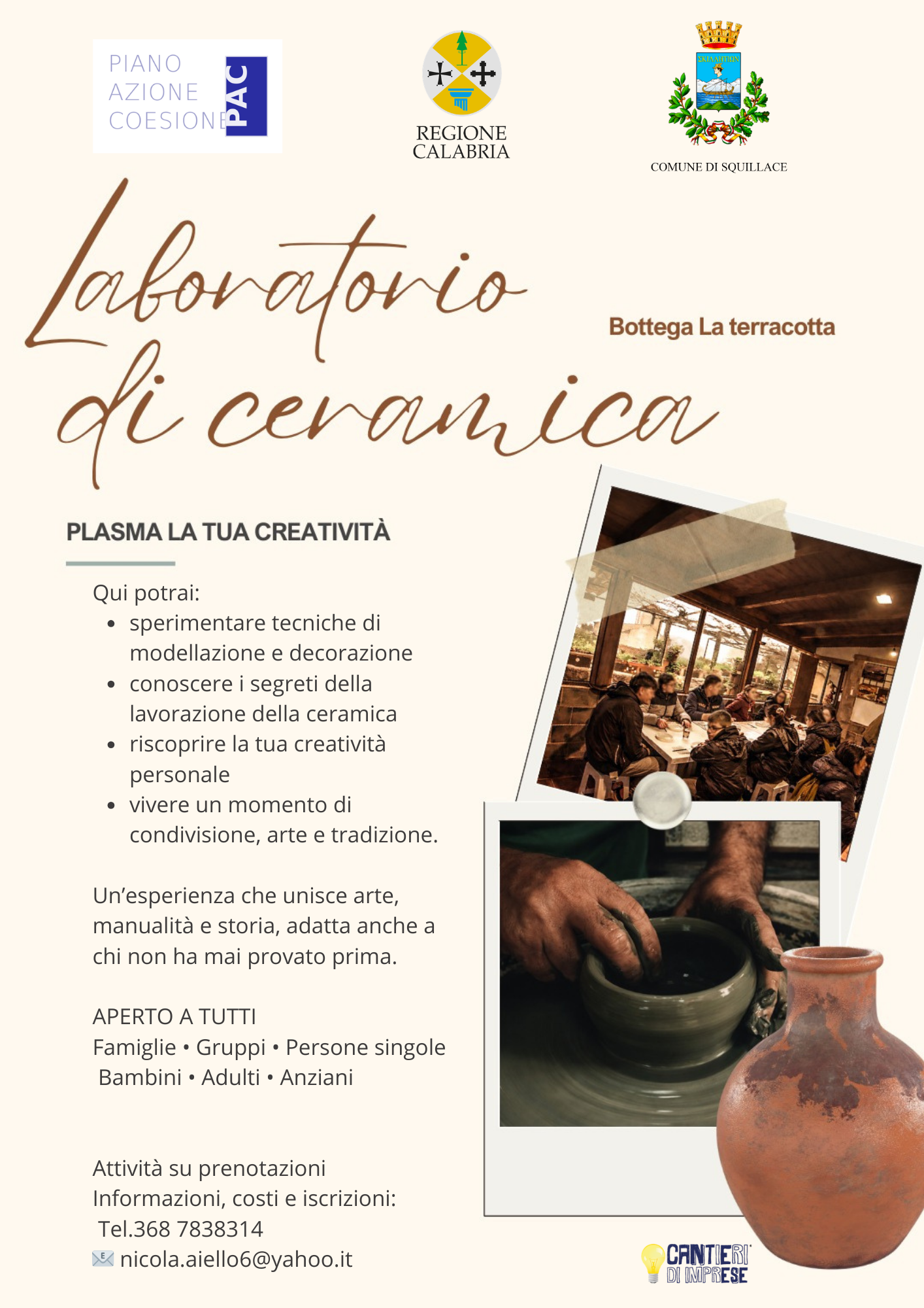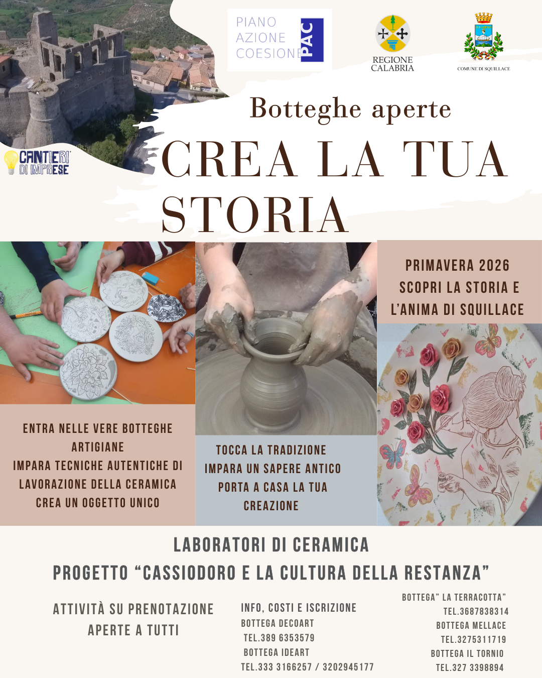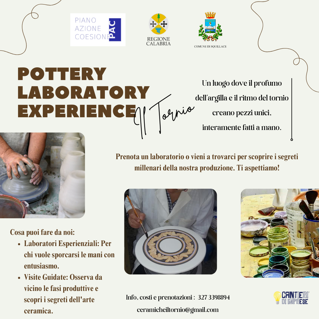 Il Comune di Squillace- Assessorato al turismo - promuove i Laboratori di ceramica “Botteghe Aperte”, iniziativa inserita nel progetto culturale “Cassiodoro e la Cultura della Restanza”, dedicato alla valorizzazione dell’identità storica, culturale e artigianale del territorio.